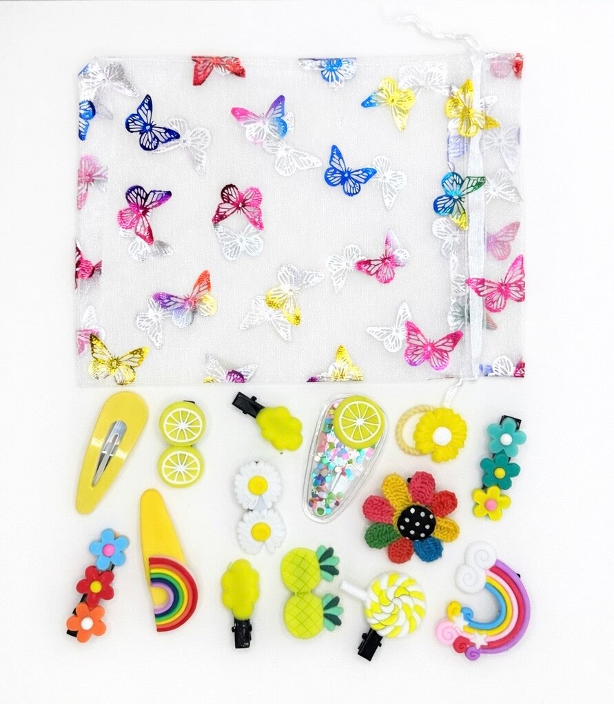 This joyful set features a delightful mix of clips inspired by summer treats and blooming gardens – from zesty lemons and colourful flowers to rainbows, lollipops and cheerful shapes. Each piece is designed to bring a pop of fun and personality to any hairstyle.
