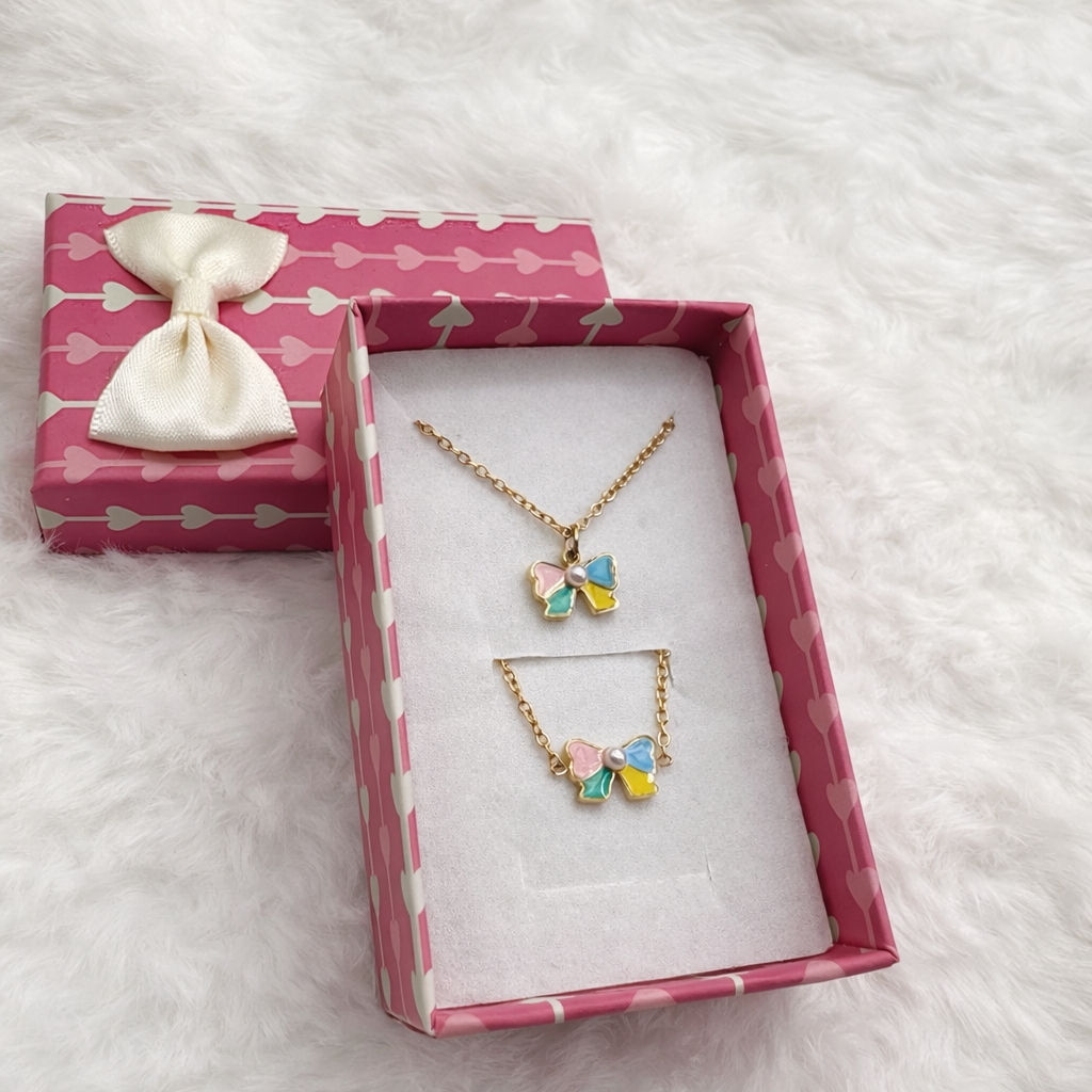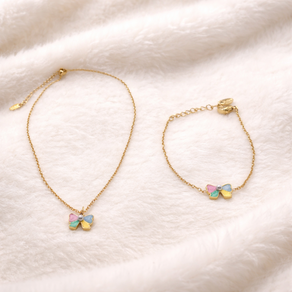 This matching set includes a dainty necklace and bracelet, each featuring a sweet butterfly charm in soft pastel colours, finished with a subtle pearl detail at the centre. Thoughtfully designed to be both playful and elegant, it’s perfect for adding a gentle touch of sparkle to any outfit.